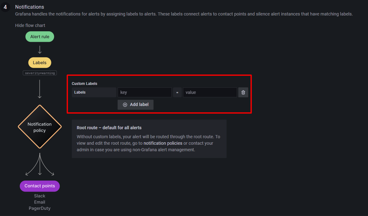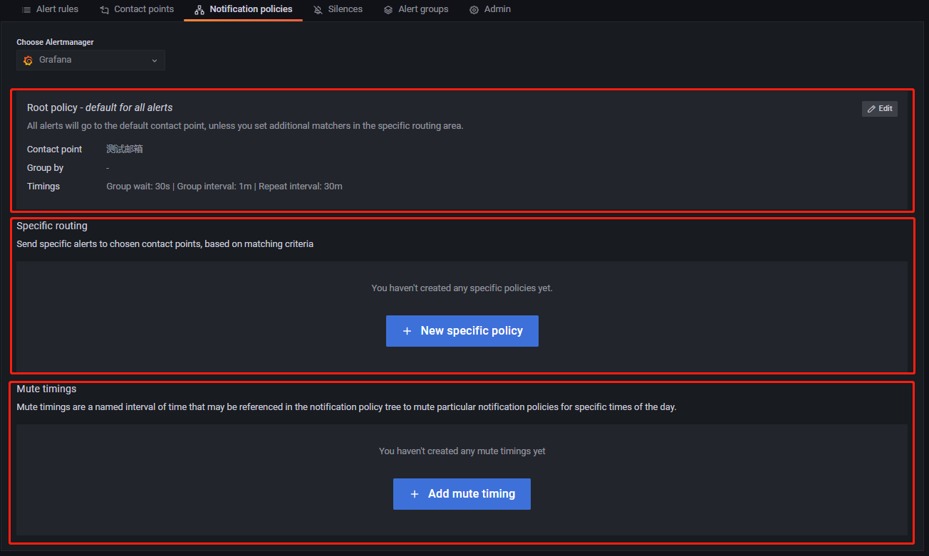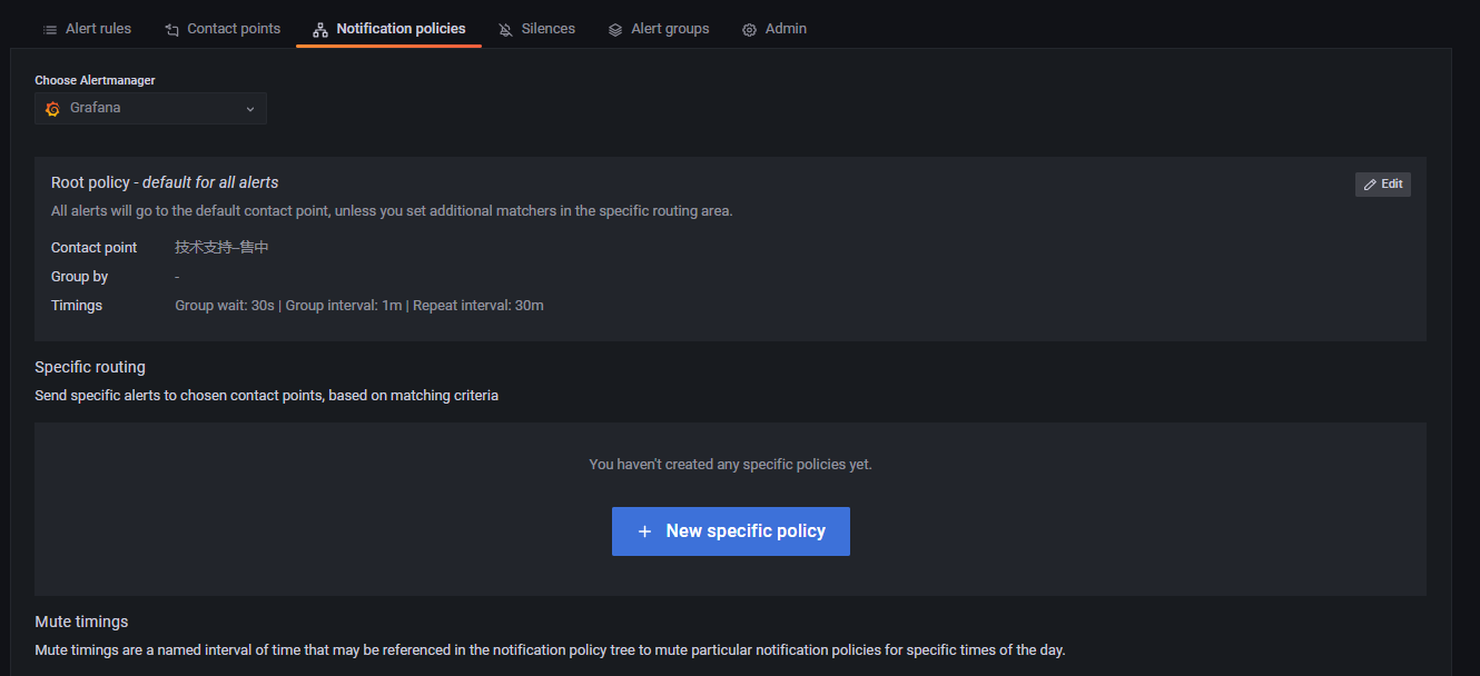设置好 Contact point 后,还要设置 Notification policies。如果之前已经设置了告警消息的默认接收者,如下所示: