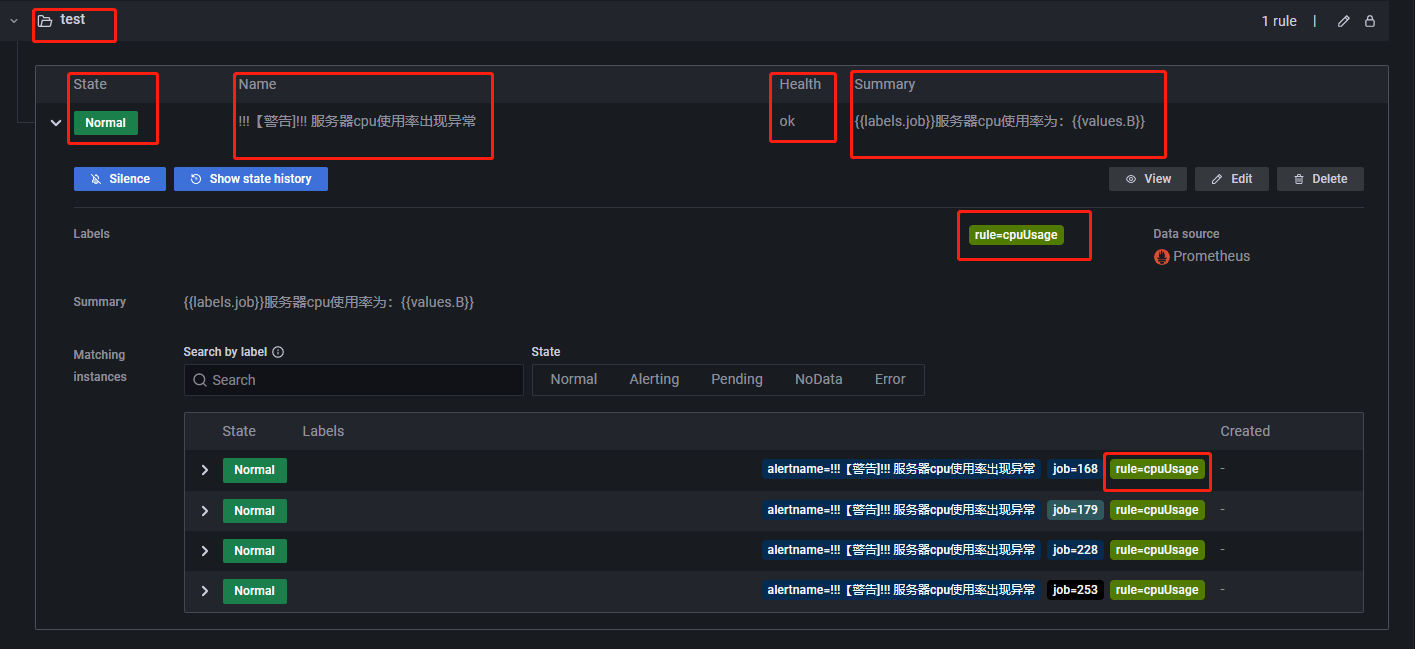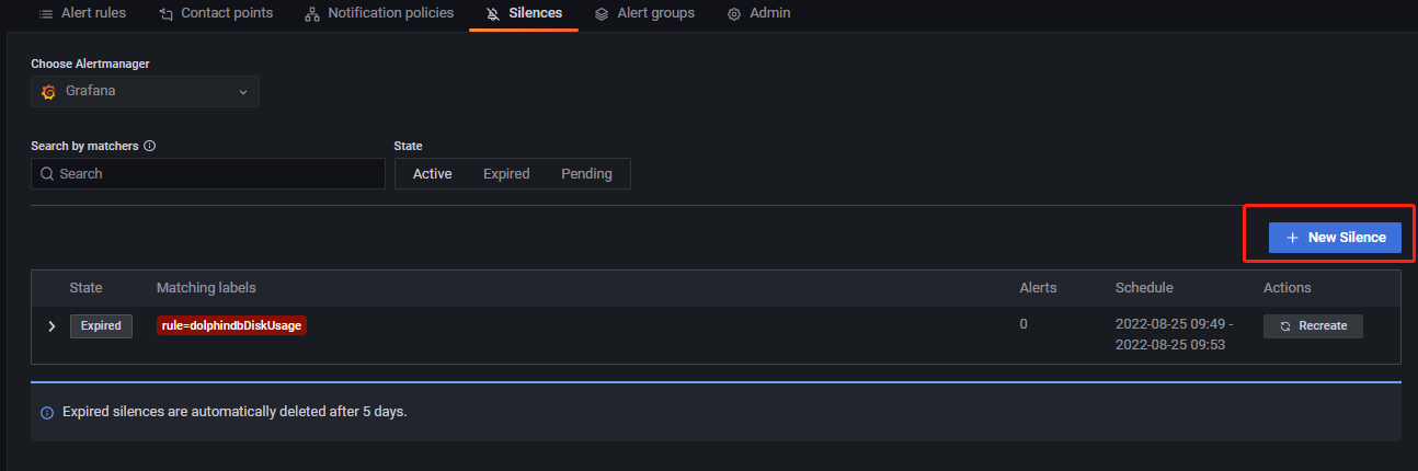 该模块主要作用为,设置某些告警规则为静默状态,即不让这些规则发送告警消息,即便它满足告警消息的发送条件。如下图所示: