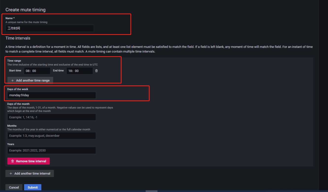 Mute timings组件实现。点击Add mute timing,进入如下所示页面: