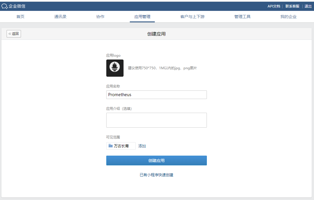 上传应用图片,给应用取一个名字,并选择应用可见范围(必须设置),创建完成后,进入如下所示页面: