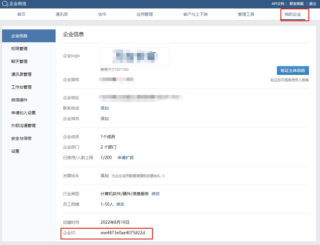 获取到你要接收信息的部门的部门 ID,并记录。最后点击我的企业,如下所示: