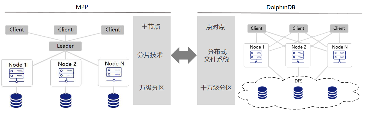 MPP(Massive Parallel Processing) 是目前主流数据仓库普遍采用的一种方案,包括开源软件 Greenplum,云数据库 AWS Redshift 等。MPP 有一个主节点,每个客户端都连接到这个主节点。DolphinDB 在数据库层面不存在主节点,是点对点结构,每个客户端可以连接到任何一个数据节点,不会出现主节点瓶颈问题。