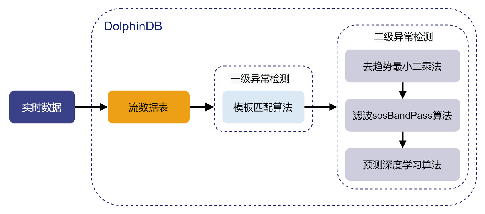 技术架构图中,DolphinDB 流数据表接收外部地震计产生的实时流数据,调用 FilterPicker 插件中的模板匹配算法对实时数据进行一级异常检测,对于异常点,先进行去趋势、滤波处理,再将结果归一化,最后调用 TensorFlow 插件进行预测,输出异常检测结果。