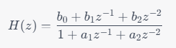 其中 z 是单位圆上的复变量,b0 b1, b2, a1, a2 是滤波器的系数。通过调整这些系数的值,可以实现不同类型的滤波器,例如低通滤波器、高通滤波器和带通滤波器等。