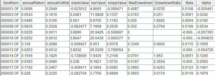 def getmetric(result2, symList){ Return = select fundNum, getAnnualReturn(value) as annualReturn, getAnnualVolatility(value) as annualVolRat, getAnnualSkew(value) as skewValue, getAnnualKur(value) as kurValue, getSharp(value) as sharpValue, getMaxDrawdown(value) as MaxDrawdown, getDrawdownRatio(value) as DrawdownRatio, getBeta(value, price) as Beta, getAlpha(value, price) as Alpha from result2 where TradeDate in 2018.05.24..2021.05.27 and fundNum in symList group by fundNum }其中,部分运算结果如下图所示: