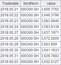 字段名 字段含义 数据类型(DolphinDB) tradingDate 交易日期 DATE fundNum 基金交易代码 SYMBOL value 基金日净值 DOUBLE 同时,本教程选取了2018.05.24 - 2021.05.27期间沪深300指数的数据,共734条,用于和基金日净值数据作对齐操作。以下是指数表在 DolphinDB 中的数据结构: