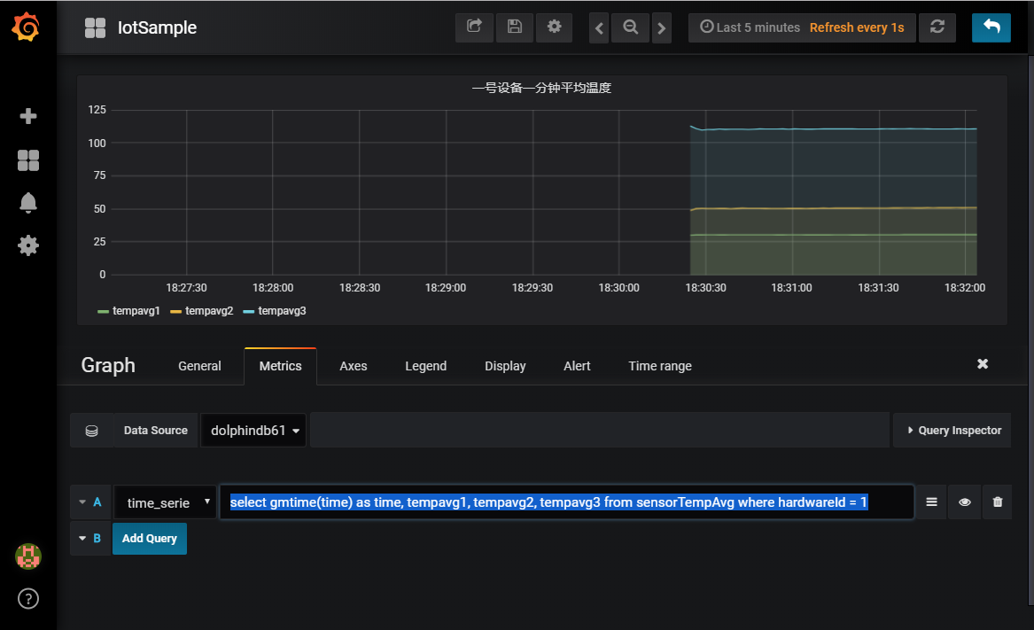 subscribeTable( tableName="sensorTemp", actionName="demoAgg", offset=-1, handler=append!{demoAgg}, msgAsTable=true)在 DolphinDB Server 端在对高频数据流做保存、分析的时候,Grafana 前端程序每秒钟会轮询实时运算的结果,并刷新平均温度的趋势图。DolphinDB 提供了 Grafana_DolphinDB 的 datasource 插件,关于 Grafana 的安装以及 DolphinDB 的插件配置请参考Grafana 教程。