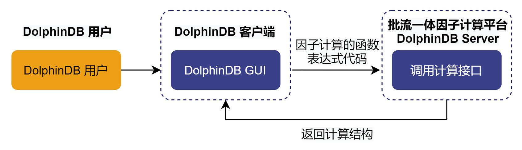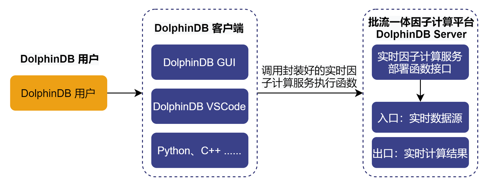 - 集成开发环境功能模块:因子业务开发人员可以把 DolphinDB GUI 和 DolphinDB Vscode 作为集成开发环境,进行因子表达式代码的开发和调试。同时可以通过各种语言的 DolphinDB API 与 DolphinDB server 进行交互,进行任务的调度和作业的执行。