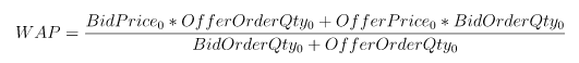 wap = (bidPrice[0]*offerQty[0] + offerPrice[0]*bidQty[0])\(bidQty[0]+offerQty[0])