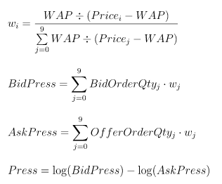 press = log((bidQty*bidw).rowSum())-log((offerQty*offerw).rowSum())