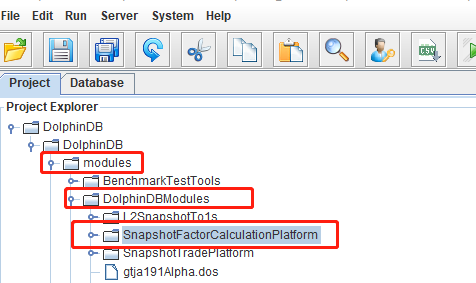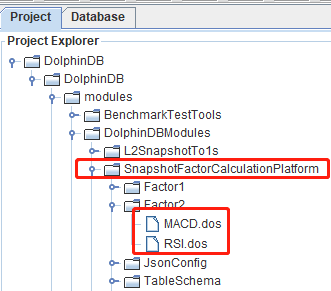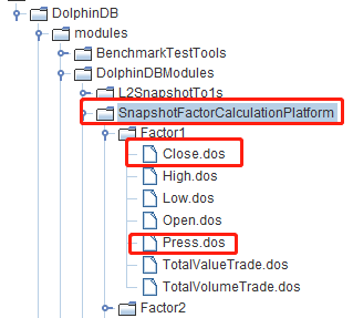 把本教程功能模块代码导入本地集成开发环境(DolphinDB GUI),功能模块源码见附录 SnapshotFactorCalculationPlatform。导入的目录结构必须严格按照下图所示结构: