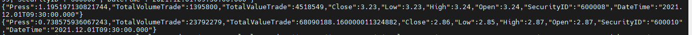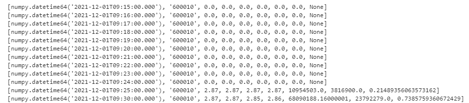 s.subscribe(host="localhost", port=8892, handler=handler, tableName="aggr1Min", actionName="sub1min", offset=0, msgAsTable=False, filter=np.array(['600010']))此处 offset 设置为 0,表示从结果表的第一行数据开始订阅,订阅返回结果如下: