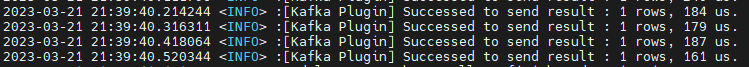 从 DolphinDB server 的监控日志可以看到,计算结果推送至 Kafka 的平均耗时约 180 微秒: