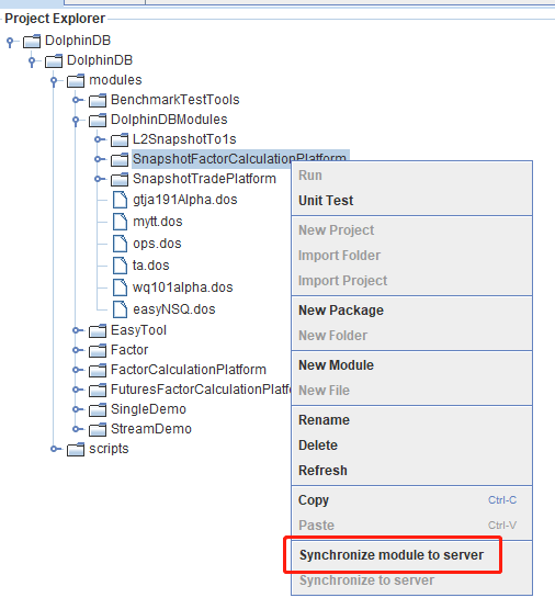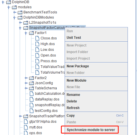 右击 SnapshotFactorCalculationPlatform 目录,把本地模块代码同步到 DolphinDB server 端。