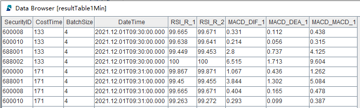snapshotCsvReplayJob(csvPath, snapshotStream)此时可以在 DolphinDB GUI 中执行函数 now(),起到刷新客户端的效果,可以看到右下角变量栏的结果表不断地在更新,查看结果表中的数据,以 1 分钟复杂因子计算结果表为例,具体内容如下: