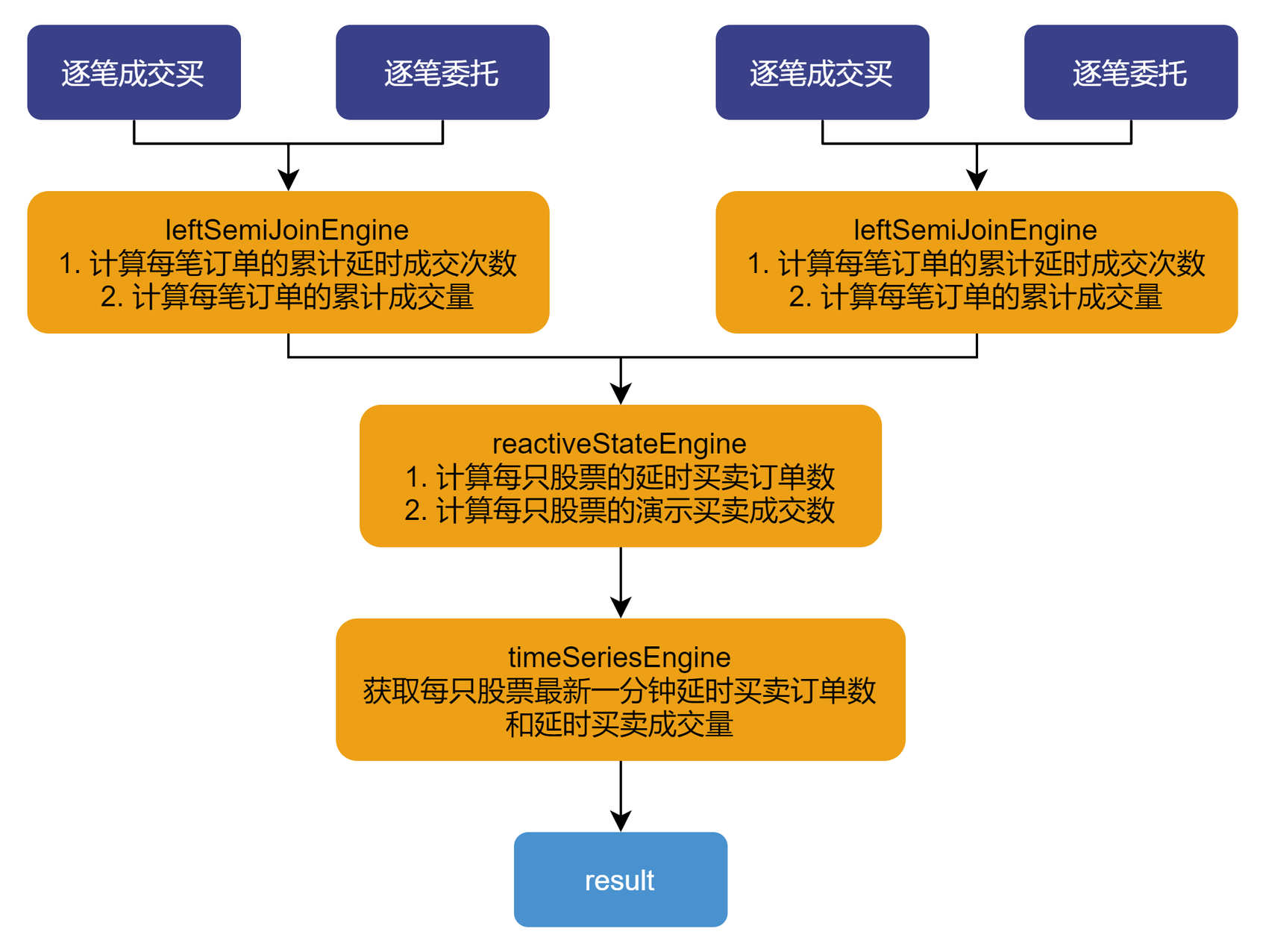 通过响应式状态引擎,计算每一只股票的买卖延时订单数量和买卖延时订单成交量指标。