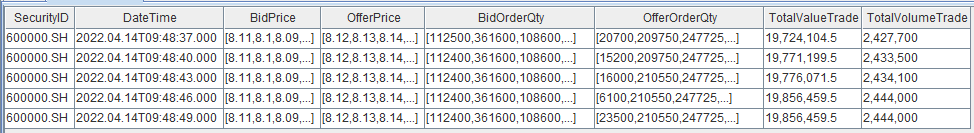 snapshotTB=select* from loadTable("dfs://TSDB_snapshot","snapshot") where date(TradeTime)=2022.04.14 and SecurityID in [`600000,`000001]
