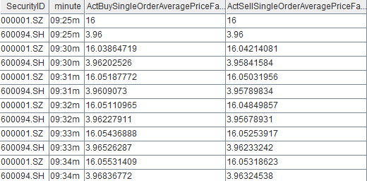 from aj(entrustTB,tradeTB,`SecurityID`ApplSeqNum) group by SecurityID,bar(DateTime,1m) as DateTime这里通过aj (asof join)把逐笔成交里的最新价格关联到逐笔委托中;对市价订单,以获取最新的成交价格作为当前市价委托单的委托价格,最后计算股票每分钟内的买卖委托金额。