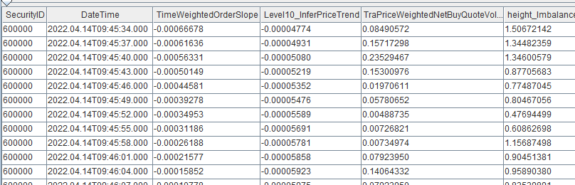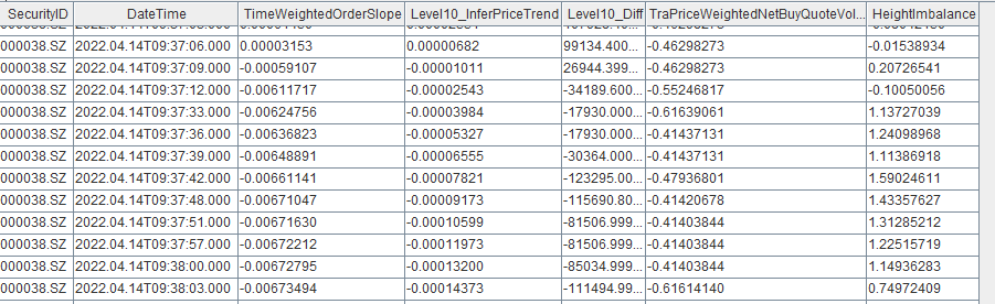result = table(1000:0, `SecurityID`DateTime`TimeWeightedOrderSlope`Level10_InferPriceTrend`TraPriceWeightedNetBuyQuoteVolumeRatio`height_Imbalance, [STRING,TIMESTAMP,DOUBLE,DOUBLE,DOUBLE,DOUBLE])