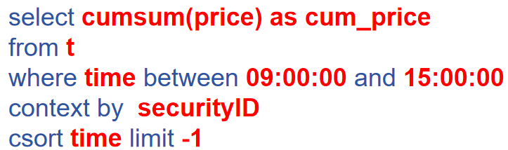 < select cumsum(price) as cum_price from objByName("t") where time between pair(09:00:00, 15:00:00) context by securityID csort time asc limit -1 >参考以上例子,可以总结出 sql 函数生成元代码的规则: