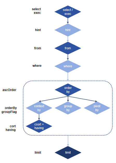 sql(select, from, [where], [groupBy], [groupFlag], [csort], [ascSort], [having], [orderBy], [ascOrder], [limit], [hint], [exec=false])sql 函数的每个参数都对应 SQL 的一个子句,通过变量传入即可动态生成对应的 SQL 元代码。