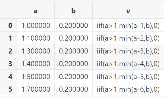 t = table(1 1.1 1.3 1.4 1.5 1.7 as a,0.2 0.2 0.2 0.2 0.2 0.2 as b,["iif(a>1,min(a-1,b),0)","iif(a>1,min(a-2,b),0)","iif(a>1,min(a-3,b),0)","iif(a>1,min(a-4,b),0)","iif(a>1,min(a-5,b),0)","iif(a>1,min(a-6,b),0)"] as v)