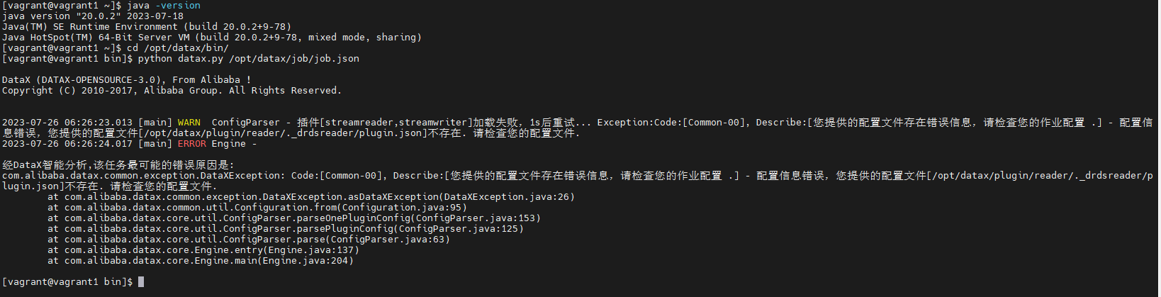 python datax.py /opt/datax/job/job.json可能出现报错,报错为 [您提供的配置文件存在错误信息... plugin.json ] 不存在: