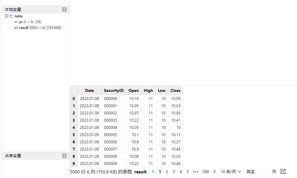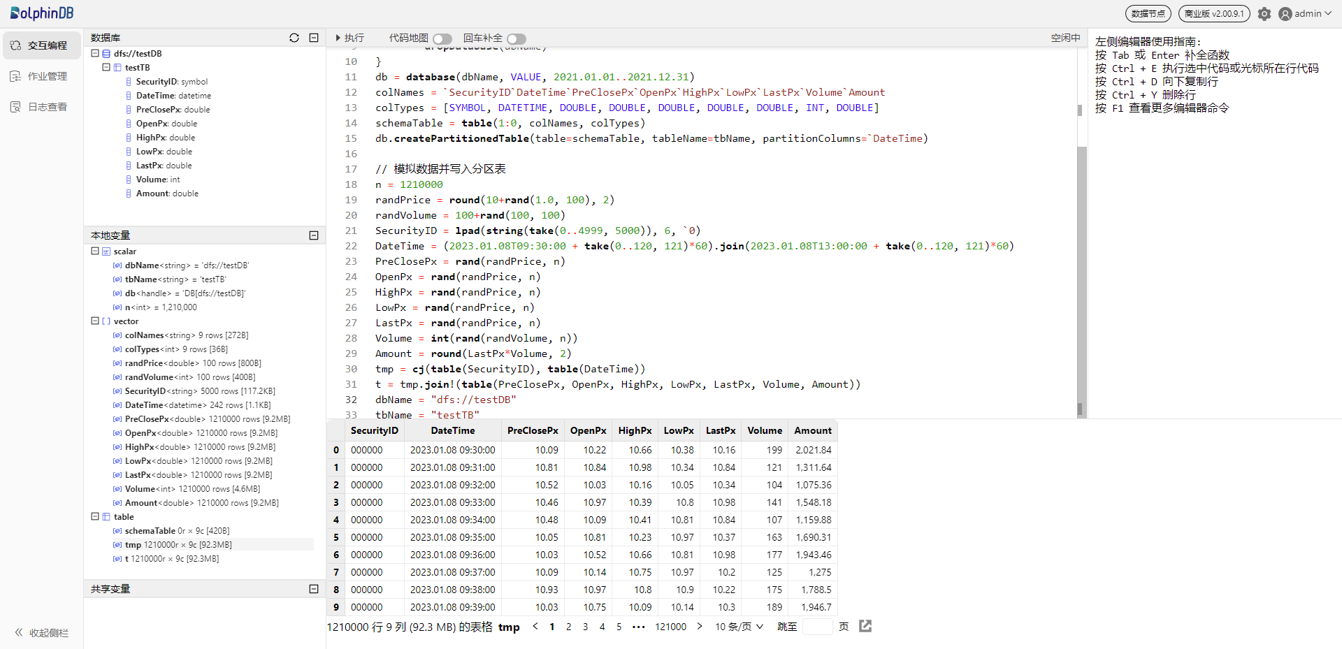 db.createPartitionedTable(table=schemaTable, tableName=tbName, partitionColumns=`DateTime)然后,执行以下语句创建 5000 个股票 1 分钟 K 线数据并写入上面创建的分区表: