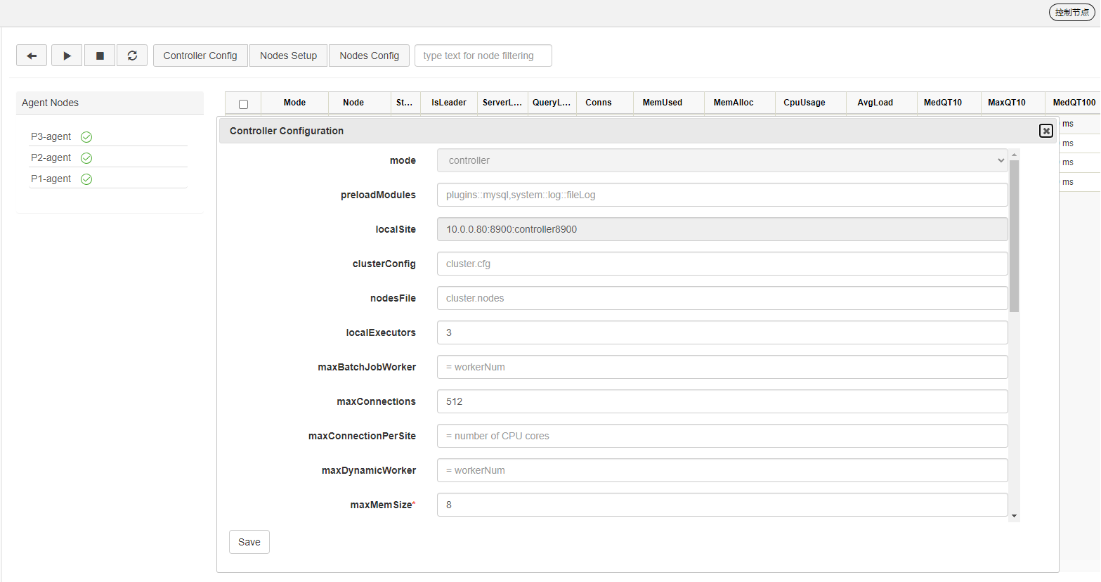 vim ./controller.cfgmode=controller localSite=10.0.0.80:8900:controller8900 dfsReplicationFactor=1 dfsReplicaReliabilityLevel=2 dataSync=1 workerNum=4 maxConnections=512 maxMemSize=8 lanCluster=0在这里必须配置的是 localSite,指定控制节点的 IP 地址、端口号和别名。其余参数用户应结合自身服务器硬件配置进行合理参数调优。