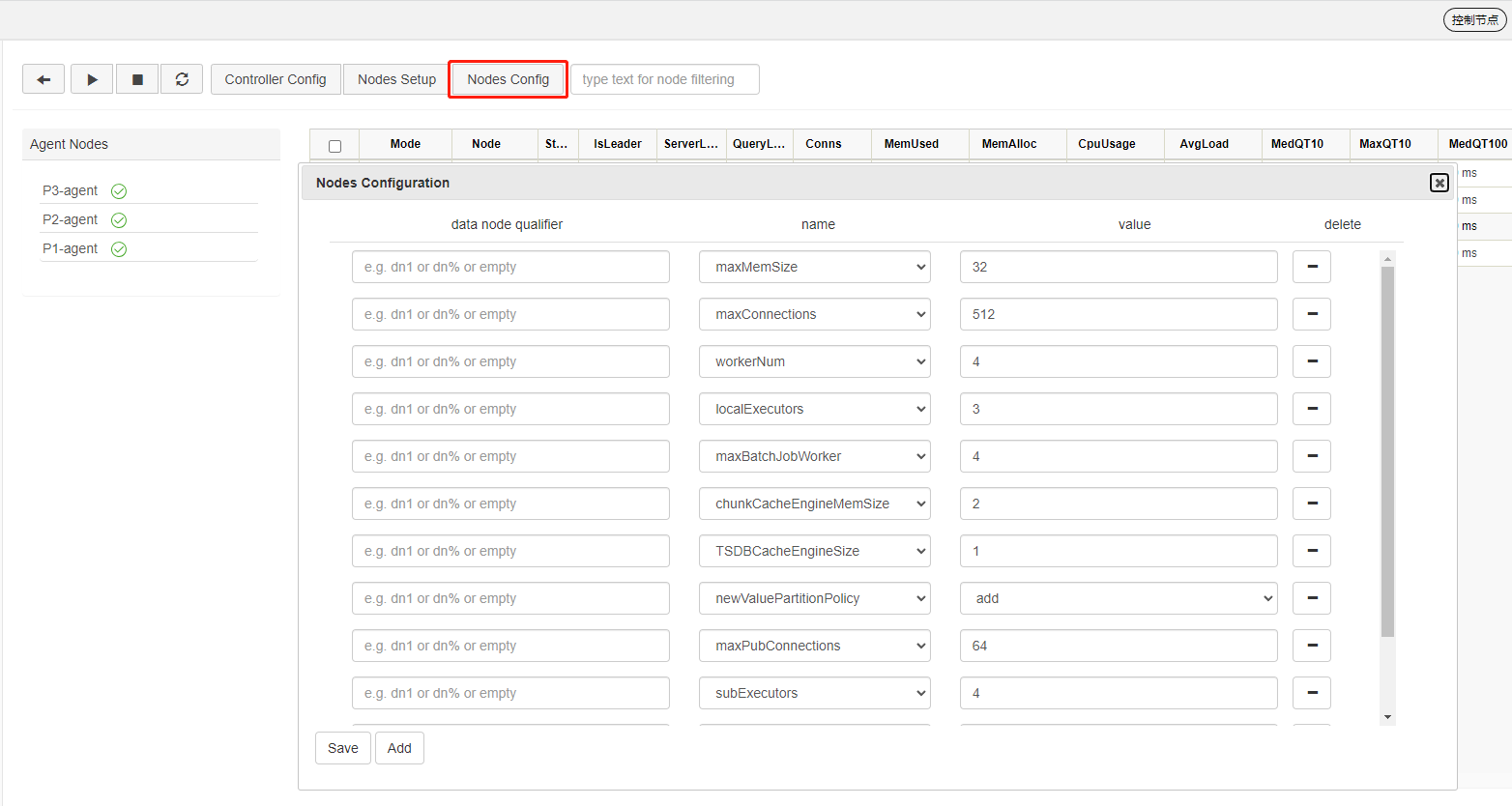 vim ./agent.cfgmode=agent localSite=10.0.0.80:8901:P1-agent controllerSite=10.0.0.80:8900:controller8900 workerNum=4 maxMemSize=4 lanCluster=0在这里, controllerSite 需要与 P1 的 controller.cfg 中的 localSite 保持一致,因为代理节点使用 agent.cfg 中的参数 controllerSite 来寻找集群中的控制节点 。若 controller.cfg 中的参数 localSite 有变化,即使只是节点别名有改变,所有代理节点的配置文件 agent.cfg 中的参数 controllerSite 都应当做相应的改变。此外,还必须配置的是 localSite,指定代理节点的 IP 地址、端口号和别名。其余参数用户可根据实际情况进行调整。