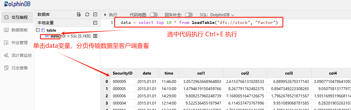 data = select top 10 * from loadTable("dfs://stock", "factor")返回: