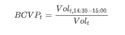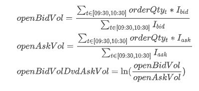 其中 openBidVol 表示早盘时间段买入订单平均委托量;openAskVol 表示早盘时间段卖出订单平均委托量;orderQtyt 表示 t 时刻的委托量;