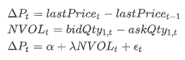 - NVOLt 表示 t 时刻的买卖一档量差;bidQty1,t 表示 t 时刻的买方一档挂单笔数;askQty1,t 表示 t 时刻的卖方一档挂单笔数;