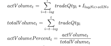 其中 tradeQtyi 表示 i 时刻的成交量;actVolumet 表示 t 时刻起的前 lag 笔订单的主动成交量之和;totalVolumet 表示 t 时刻起的前 lag 笔订单的总成交量;指示函数 I 含义如下: