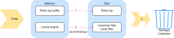 • OLAP 引擎:当缓存中的数据量达到 OLAPCacheEngineSize 的 30% 时,cache engine 会将内容写到列文件,完成回收。
