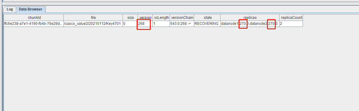 如图所示,其中 version 字段对应 Controller 上的 Chunk 版本信息为 270,而 replicas 对应 DataNode 上的 Chunk 版本信息,符合(a)场景,Controller 上版本信息明显低于 Data Node。可以使用下面函数 forceCorrectVersionByReplica 修复。该函数语法如下: