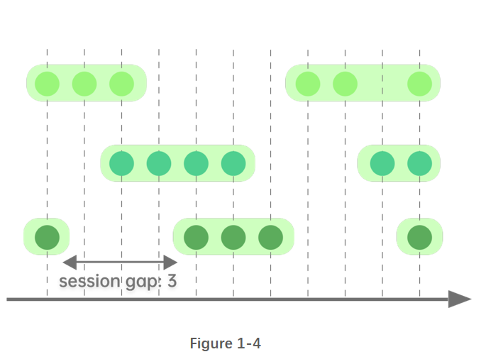 会话窗口之间的切分,是依据某段时长的空白:若某条数据之后指定时间长度内无数据进入,则该条数据为一个窗口的终点,之后第一条新数据为下一个窗口的起点。会话窗口的窗口长度可变。