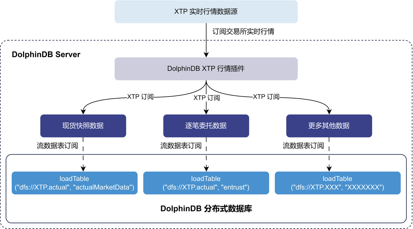 基于 XTP 官方 C++ SDK,DolphinDB 开发了 XTP 插件,提供便捷高效的方式将 XTP 实时行情数据导入 DolphinDB,进行流计算处理及持久化存储。