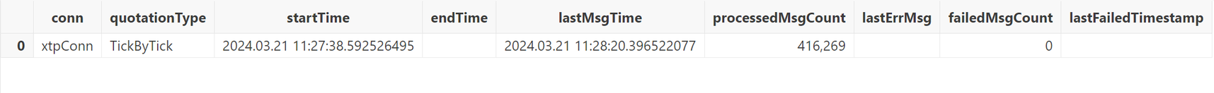 XTP::getStatus(xtpConn)此处以逐笔数据为例,用户可以根据该方法,观察到对应类别行情数据的开始时间、结束时间、最后处理的消息时间、已处理数据条数、最后错误信息、失败行情条数和最后失败行情时间戳的内容。