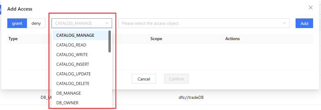 - Select or enter the access object. The available access object vary