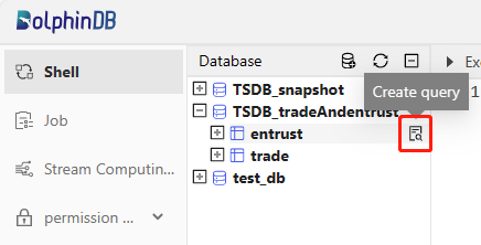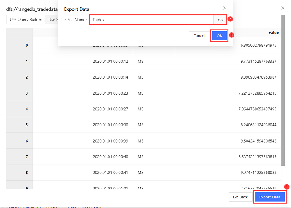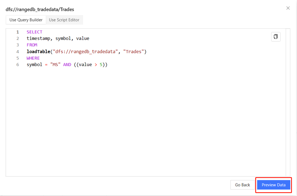 In the DolphinDB web interface, users can query a table in two ways: Query Builder and Script Editor. After the query, users can preview and directly export the query result in CSV format.