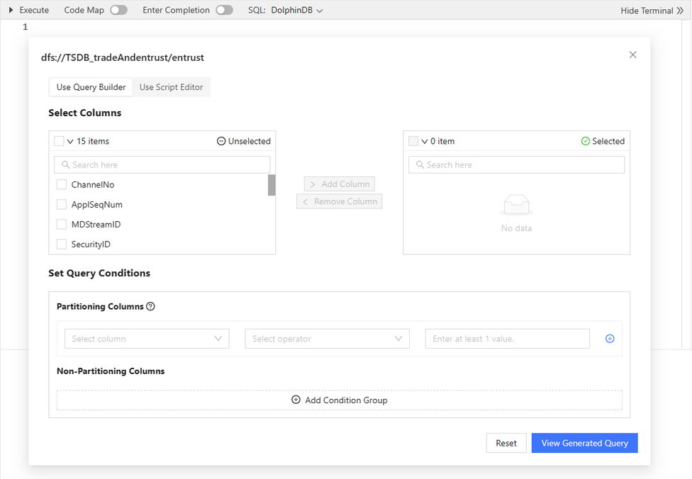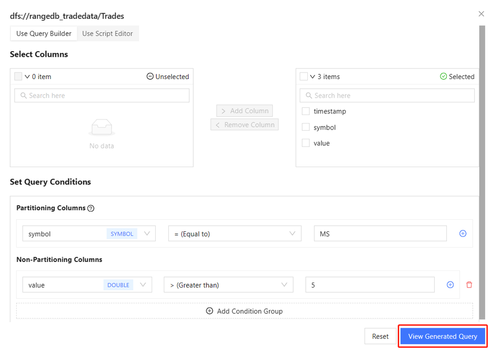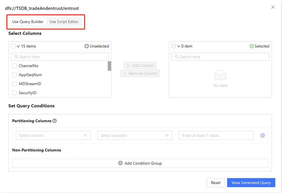 After column selection and condition setting, users can click View Generated Query to dynamically generate corresponding SQL scripts. To set the settings, users can click Reset.
