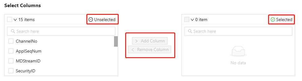 To add columns for queries, users can select one or multiple columns in the box of unselected columns on the left, then click Add Column; to remove columns for queries, users can select one or multiple columns in the box of selected columns on the right, then click Remove Column.
