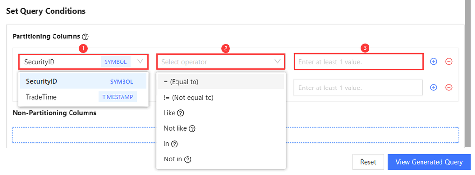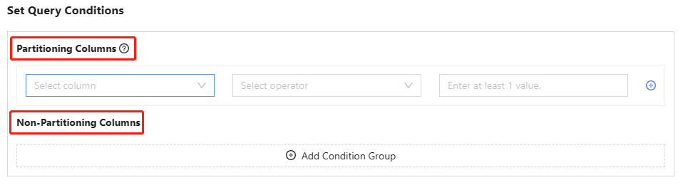 In this section, users can set conditions on partitioning columns and combine them with conditions on non-partitioning columns using the AND operator. Users can set one or multiple conditions. A query condition consists of three required items — column name, operator, and value.