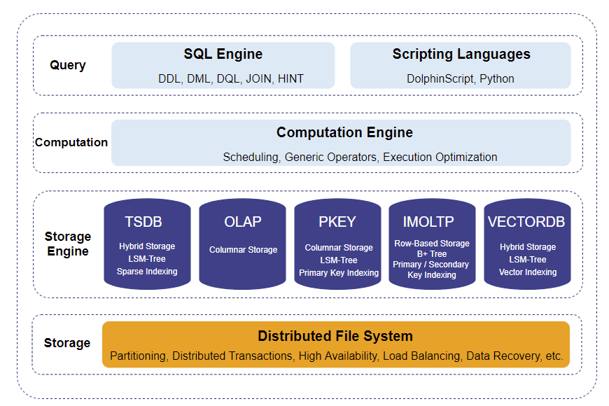 - Query layer: Compiles and parses programming languages, supporting DolphinScript (including SQL-92 compliant statements) and Python.