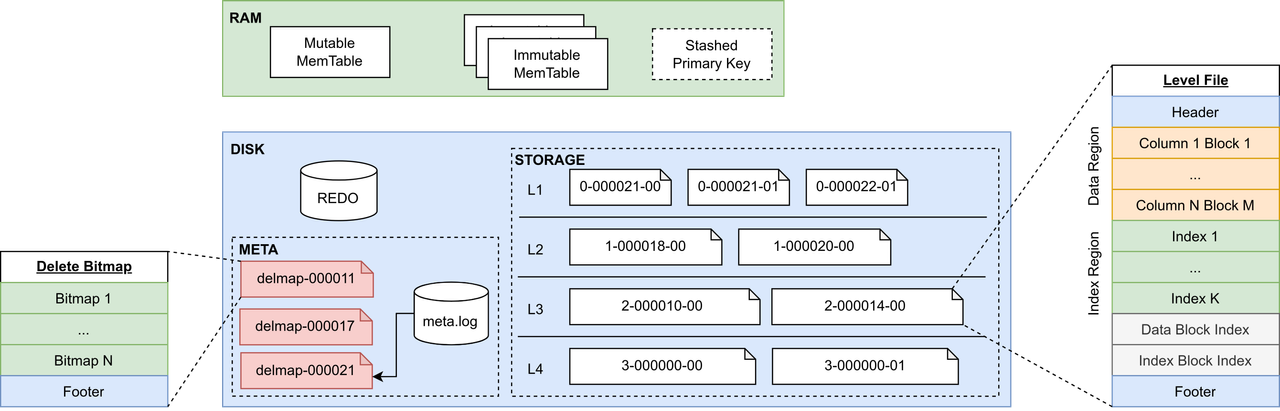 - STORAGE: Houses the data of the storage engine, organized into four levels. Each level contains multiple level files. Records within a level file are sorted by their primary key.