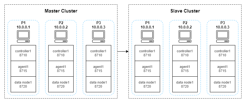 The asynchronous replication often involves a primary storage (the master cluster) and one or multiple secondary replicas (the slave clusters). At least two clusters are required, which can be standalone, multi-machine, or high-availability clusters. See DolphinDB Single-Server Cluster Deployment, DolphinDB Multi-Machine Cluster Deployment, and DolphinDB High-availability Cluster Deployment.