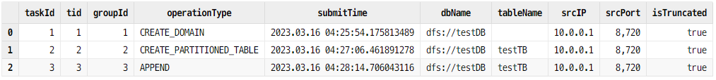 As shown above, the latest task was received via the controller 10.0.0.3:8711, and the last finished task ID is 3.