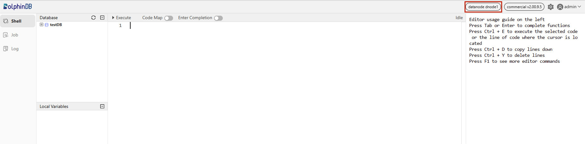 Data nodes can be used for data storage, queries and computation. The following example shows how to create databases and write data on data nodes. First, open the web interface of the Controller, and click on the corresponding Data node to open its Shell interface: