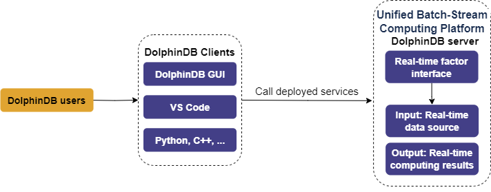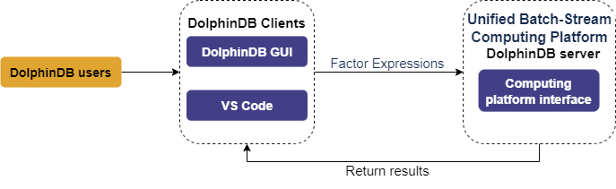 - Integrated development environment (IDE): Quant researchers can use the DolphinDB GUI and the DolphinDB plugin for Visual Studio Code as IDEs for factor development and testing. Additionally, researchers can also interact with the server through DolphinDB APIs to get the real-time results from the computing service.